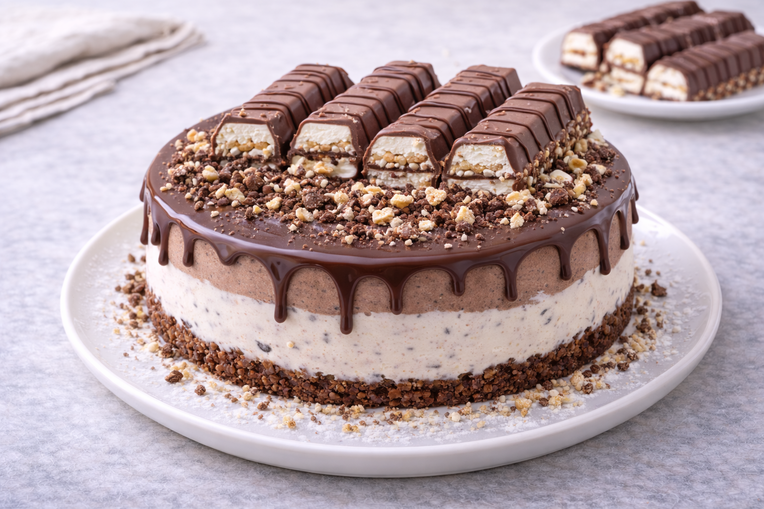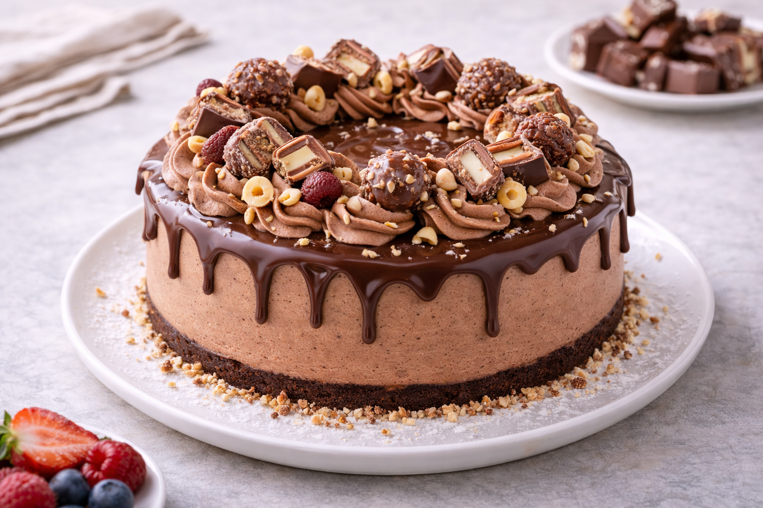 Una cheesecake Kinder Bueno irresistibile, dal cuore cremoso alla nocciola, base al cacao e una ricca decorazione di cioccolato e wafer croccanti.