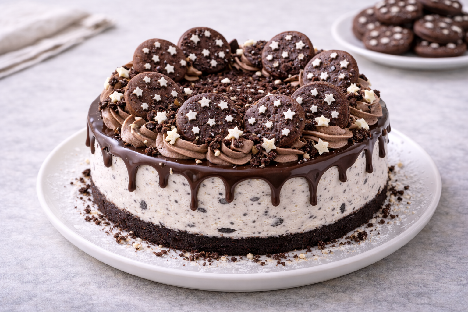 Una cheesecake Oreo cremosa e decisa, con base croccante al cacao e una ricca farcia al gusto biscotto e panna.