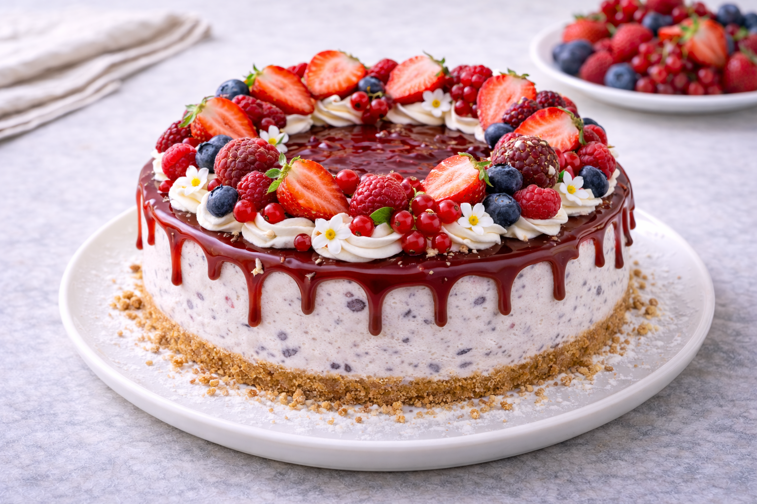 Una cheesecake ai frutti di bosco fresca e delicata, con crema vellutata e una copertura di frutti rossi dal gusto equilibrato e profumato.