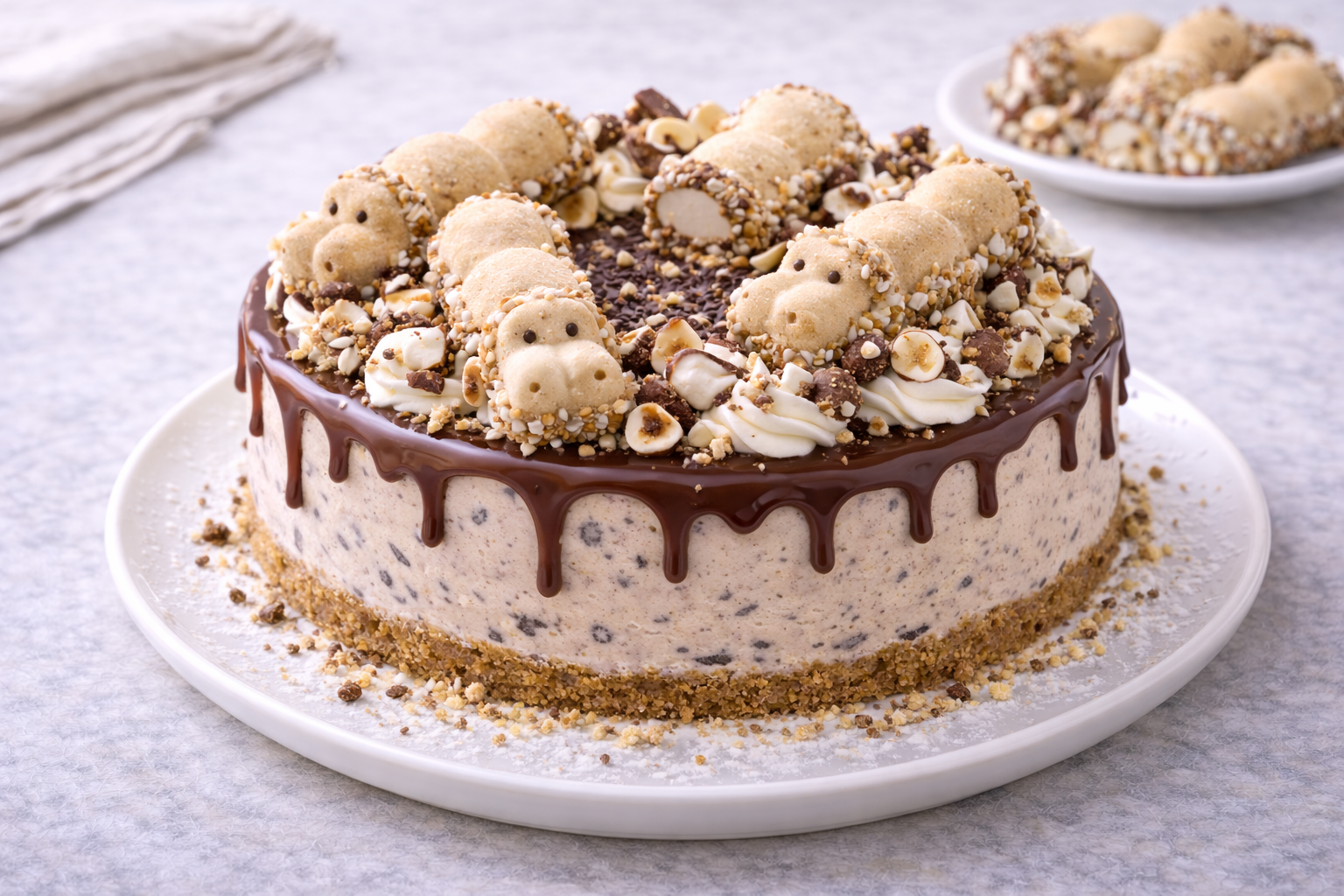 Una cheesecake Happy Hippo golosa e cremosa, con note di nocciola, wafer croccante e una copertura di cioccolato irresistibile.